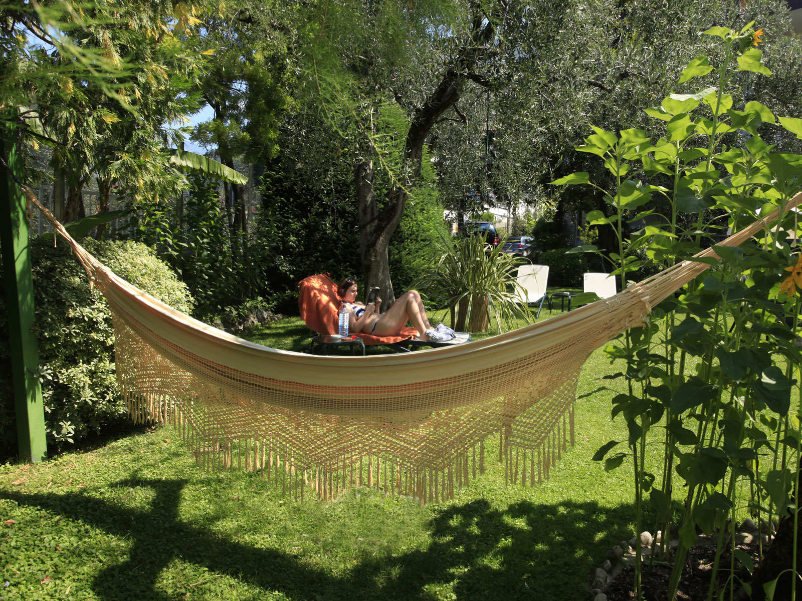- Ampio giardino con sdraio, amache e zone d’ombra.