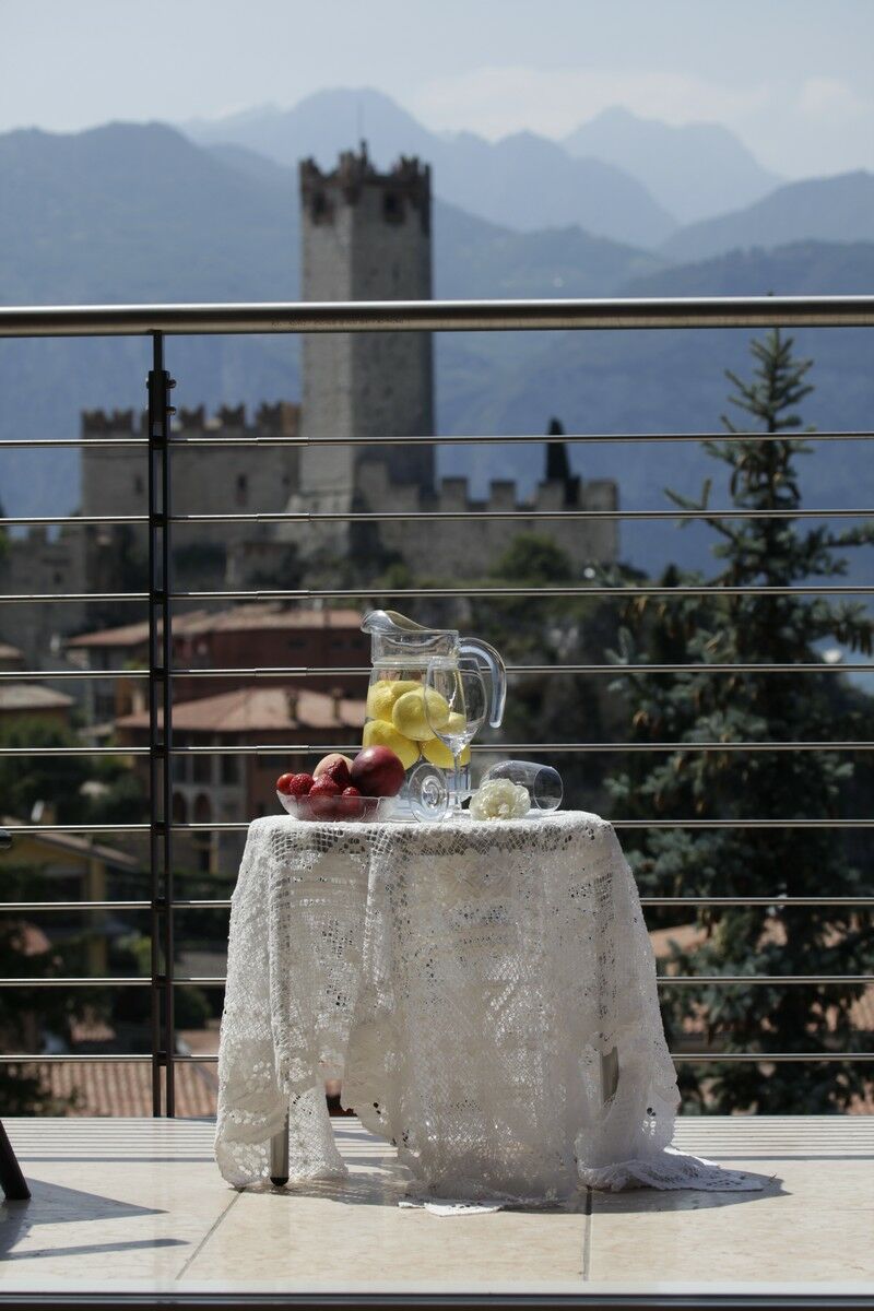 Dal balcone, il panorama abbraccia il blu del lago e il profilo suggestivo del Castello di Malcesine, trasformando ogni momento in un ricordo speciale.